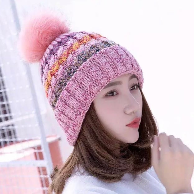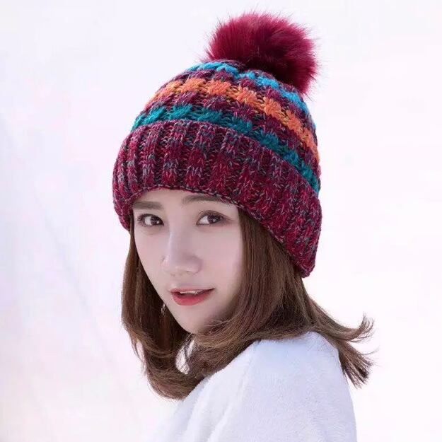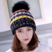 リアルファー ポンポンニット帽 ボーダー